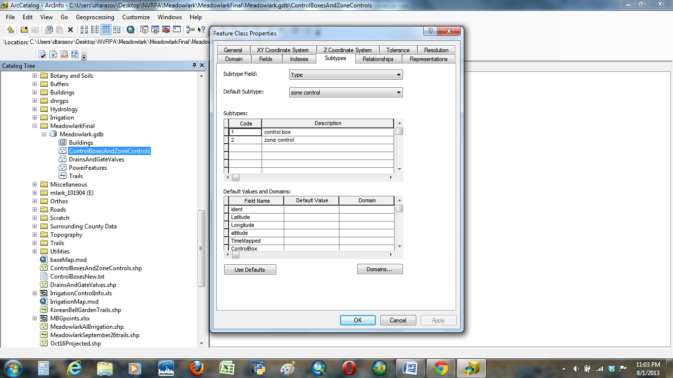 The following file geodatabase was created by me in order to facilitate the mapping of certain irrigation and electrical features in Meadowlark Botanical Gardens in northern Virginia, operated by the Northern Virginia Regional Park Authority. The feature class in question contains two types of irrigation features, control boxes and zone controls. The subtype field has two possible values, 1 (control box) and 2 (zone control). To allow for easier addition of new features in the future, 2 was chosen as the default subtype, since zone controls are much more common than control boxes. While the features’ actual locations cannot be disclosed on this site, a screenshot showing the database’s properties can be seen below: